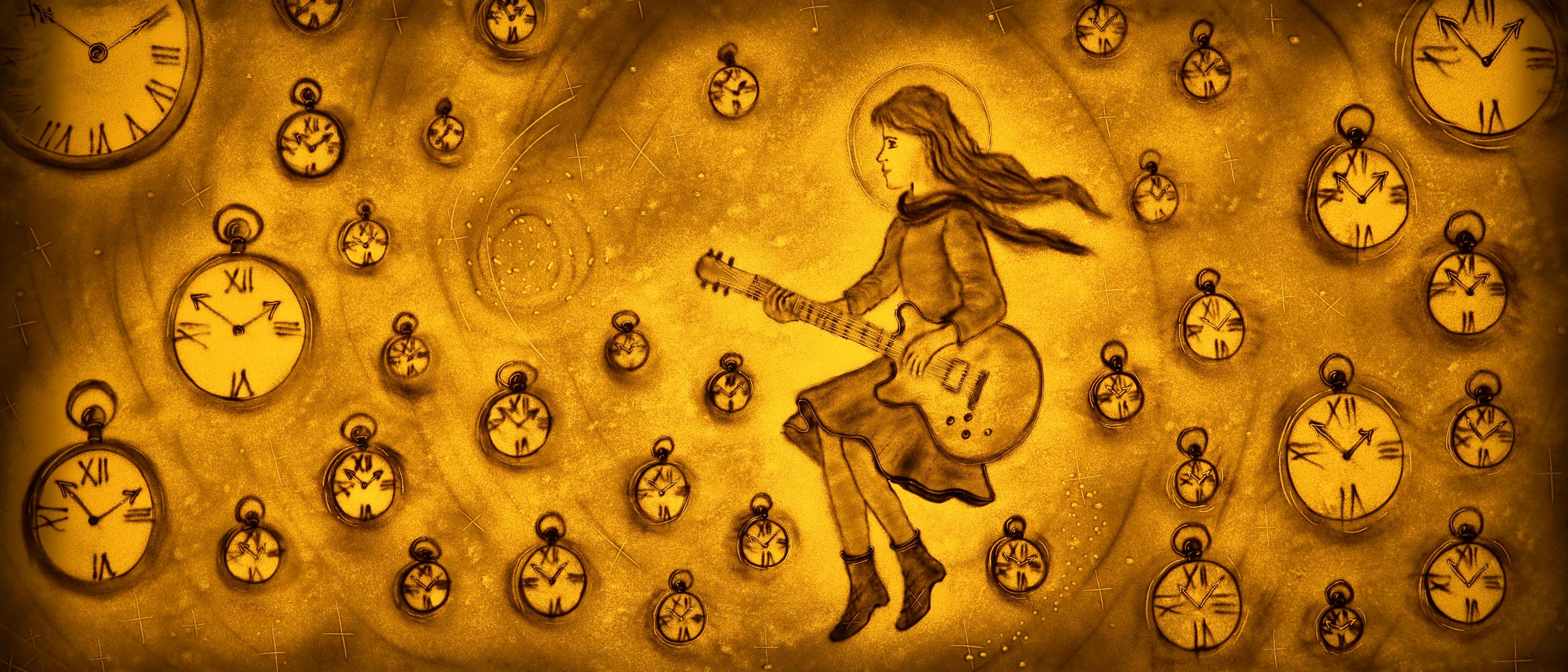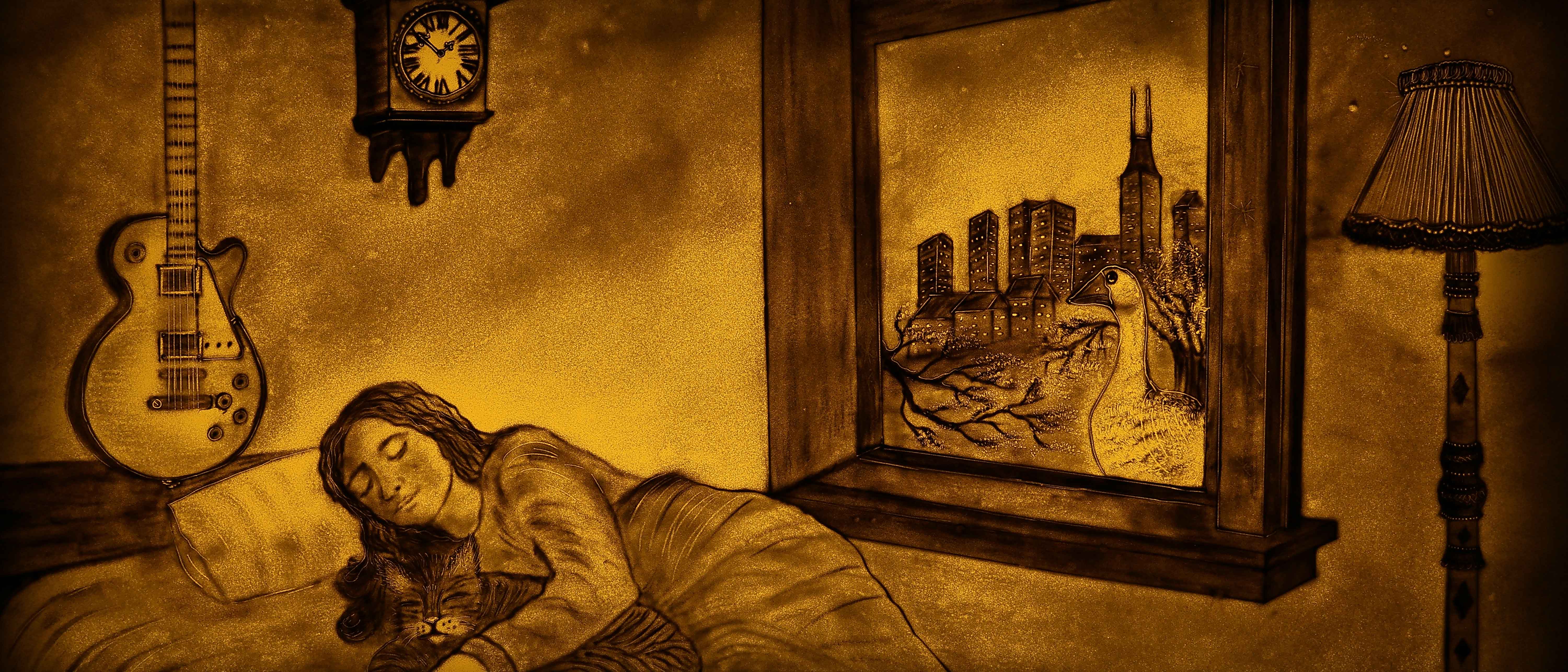 During the performance, the composer plays beautiful live melodies on a Gibson electric guitar. The golden sand animation perfectly fits the Martian theme.